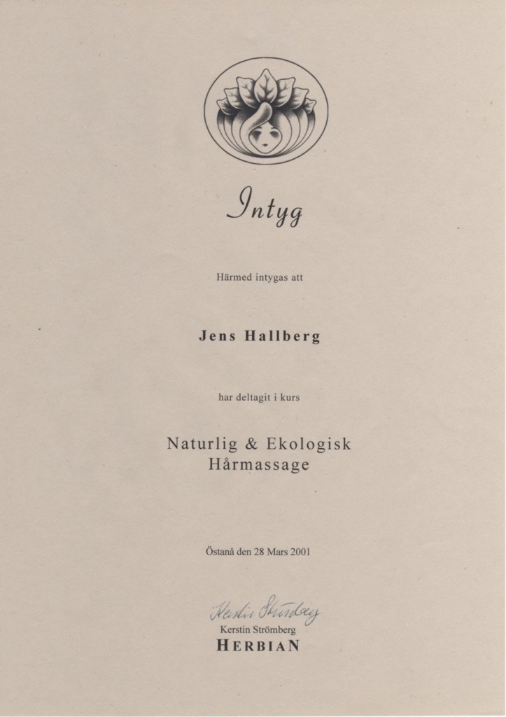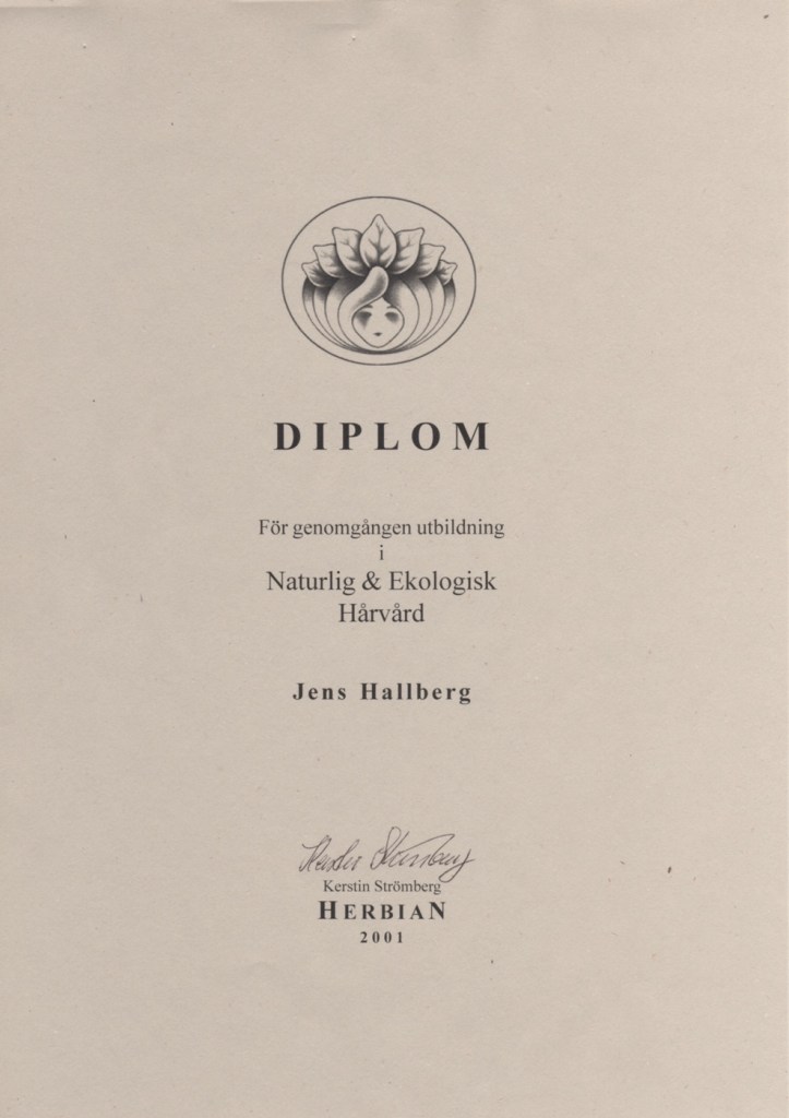 Jag som driver salongen Grön Frisör heter Jens Hallberg och är damfrisör och herrfrisör sedan 1987, då jag tog frisörexamen i Kristianstad. Med en livsväg som ingen plattång rått på har jag aldrig varit speciellt förtjust i att låta andra få alltför stort inflytande över vad jag ska ägna mig åt. Därför öppnade jag min första egna salong i Malmö samma år. Jag var 19 år, och det var andra tider, andra idéer. Intresset för miljö och hälsa fanns där, men det skulle ta många år innan jag började hitta fungerande former för det, just som frisör.